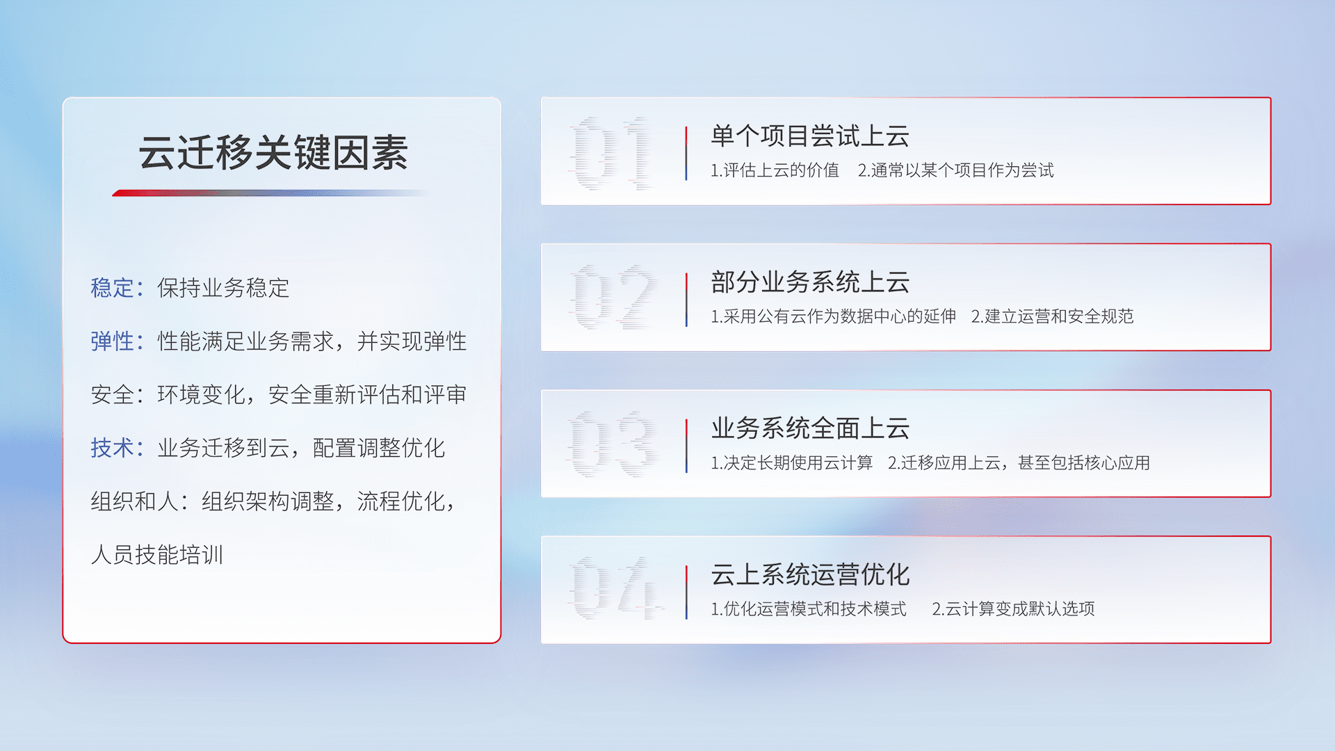 结合实际业务,,从规划设计、、云平台选型、、、、云原生改造、、、数据迁移、、、、集成交付,,,,迁移全过程为客户识别最佳上云路径,,,,做好风险识别管理,,,,设计网络架构、、、身份权限、、安全审计合规、、、操作审计、、、日志审计、、、、监控告警策略、、、多站点容灾设计等,,,,对云上基础设施进行整体规划,,提升IT治理水平,,,以满足弹性、、高可用、、、高性能的需求。。。。